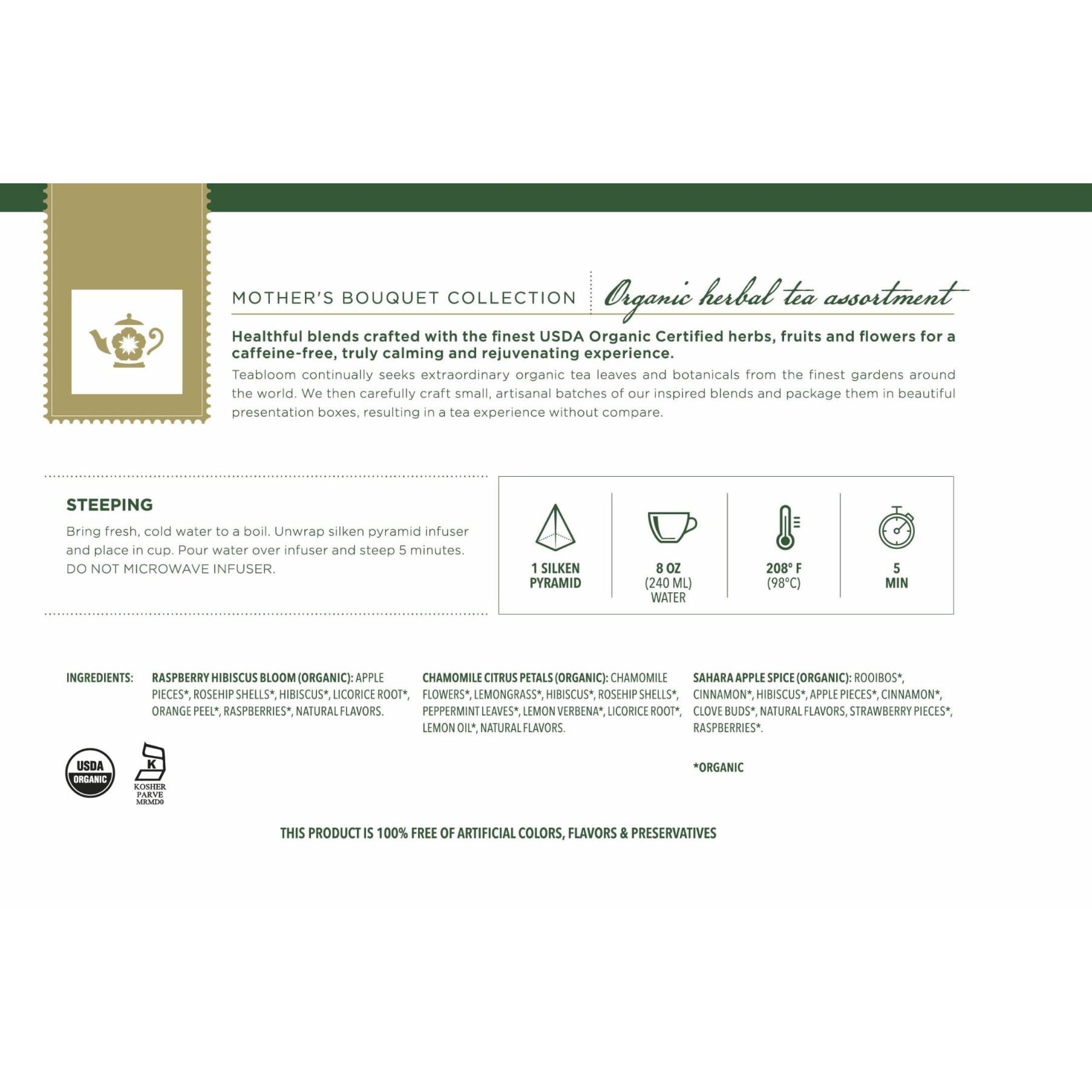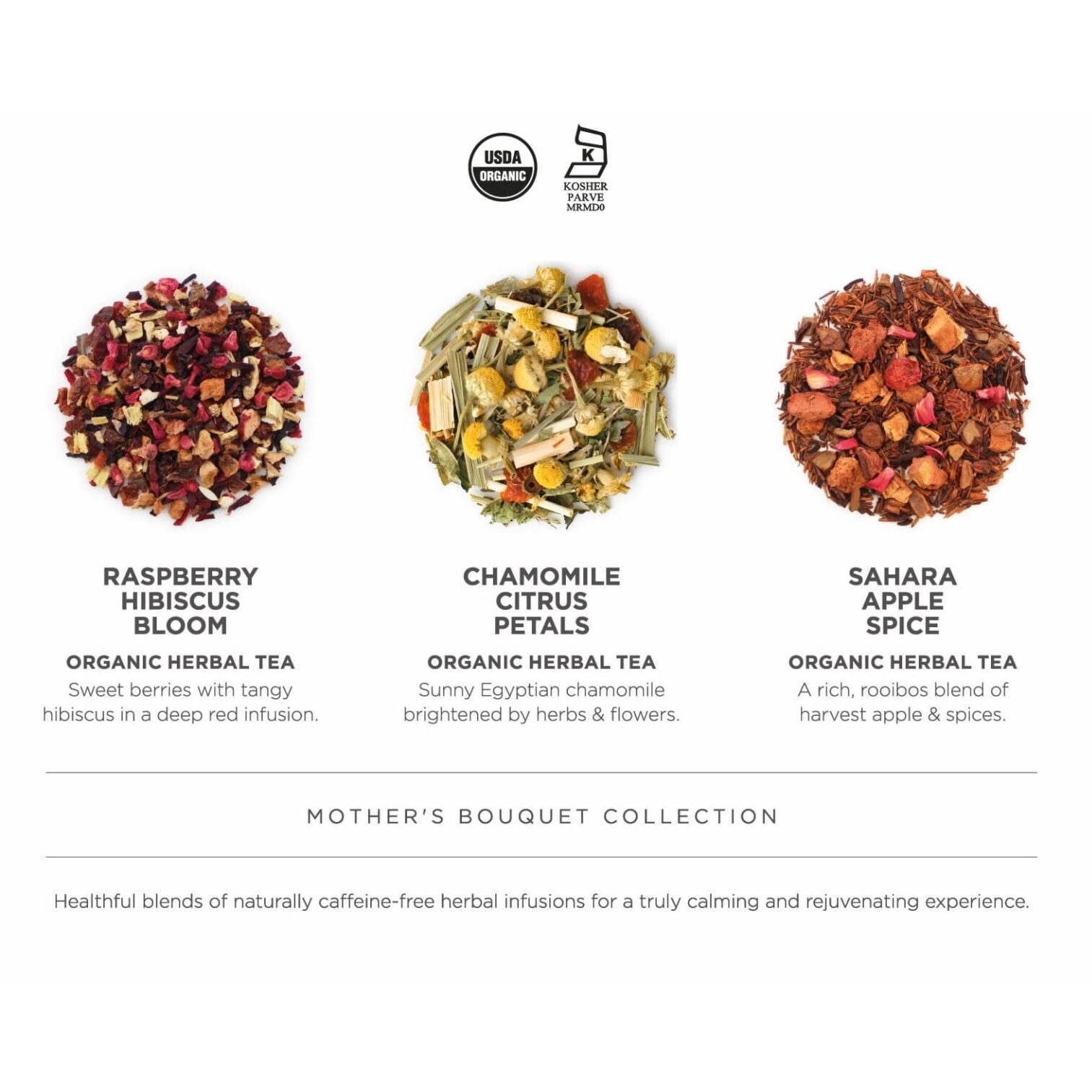 The Mother's Bouquet caffeine-free tea gift set is a rare and unique collection of organic and kosher certified herbal tea blends that soothe your body and soul. Ingredients are sourced from Europe and harvested in small batches for an authentic and consistent experience in every cup.
