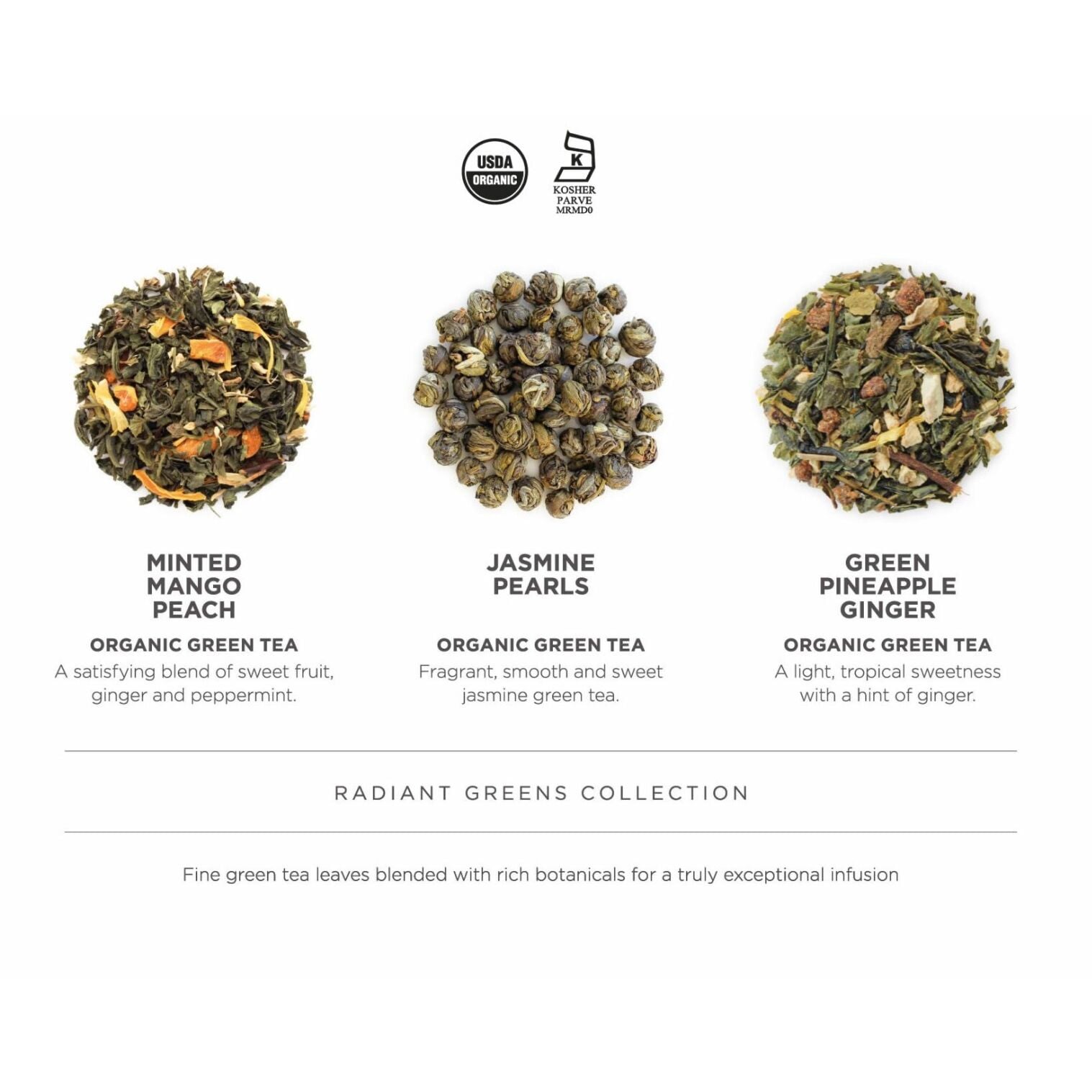 Radiant Greens tea sampler features exceptional earthy green teas that soothe your mind, body, and spirit. Each tea starts with organic green tea leaves harvested in small batches and blended with premium flowers and fruit. This ensures a consistent flavor and experience with every single cup.