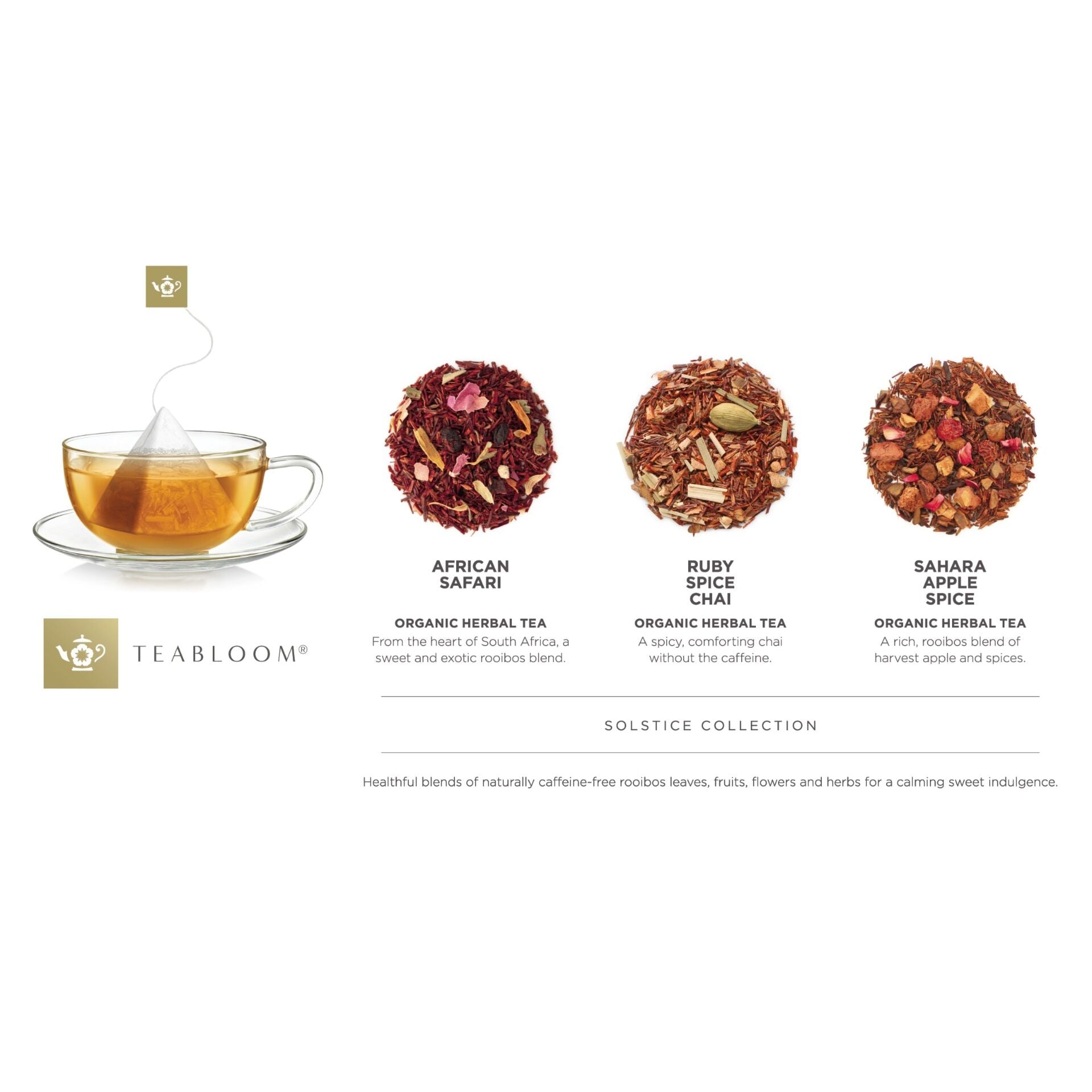 Elevate your everyday tea ritual or give the Solstice rooibos tea sampler as a thoughtful tea present to someone special.