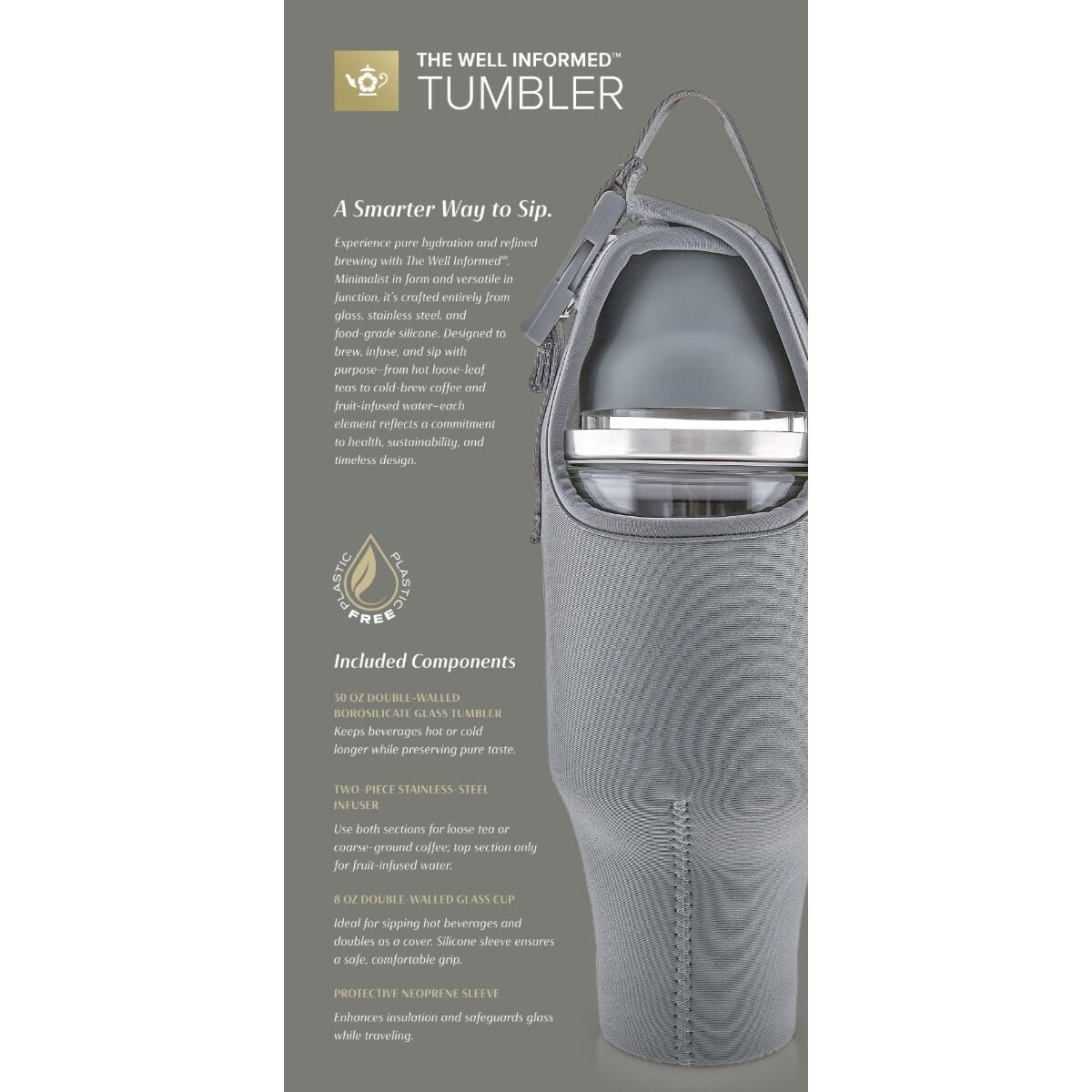 The Well Informed Tumbler is a beautifully designed, double-walled, insulated borosilicate glass travel tumbler that lets you brew, infuse, and enjoy your favorite beverages anywhere. From loose-leaf tea and cold-brew coffee to naturally flavored fruit water, this mindful all-in-one system keeps your drinks at their ideal temperature longer while replacing disposable cups with a healthier, more sustainable ritual.