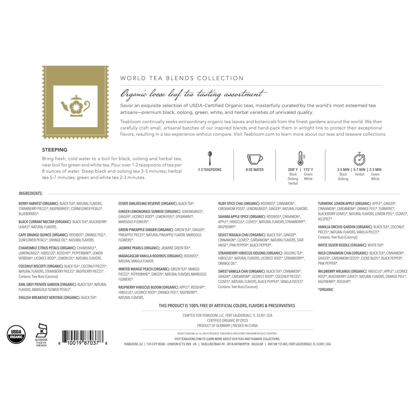 *For a complete list of ingredients of this loose-leaf tea set see product images or reference the included guide/tasting menu.
